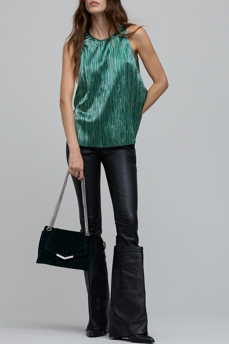 Empiècement en métal avec logo et fermeture par goutte boutonnée au dos.
