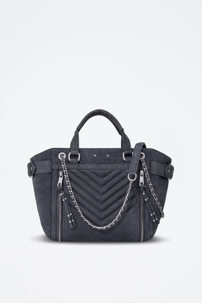 Effet matelassé, logo en relief, empiècements en métal et zips devant.