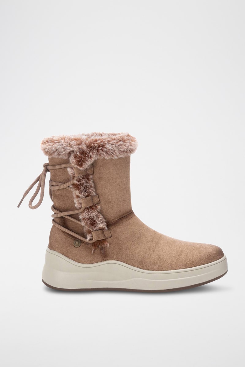 Fermeture zippée sur le côté intérieur et à lacets à l’arrière.