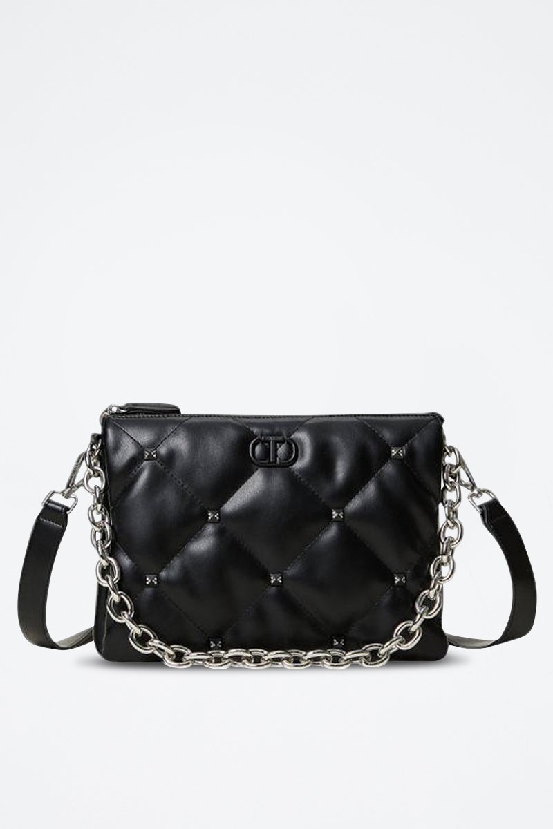 Chaînette décorative, logo métallique, effet matelassé et empiècements en métal devant.