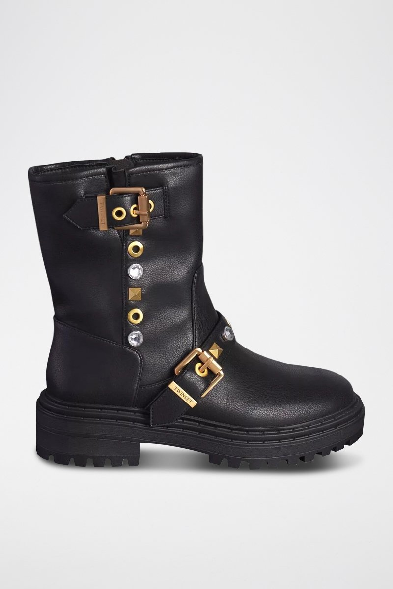 Brides à boucle, strass, empiècement en métal devant et sur le côté extérieur.