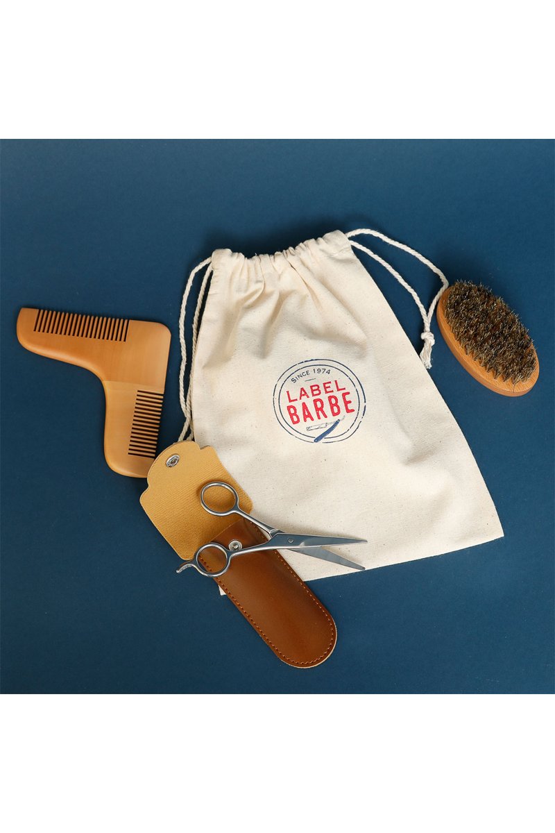 Il contient une brosse, des ciseaux avec leur housse, un pochoir à barbe qui fait office de peigne, le tout rangé soigneusement dans une belle pochette en coton.