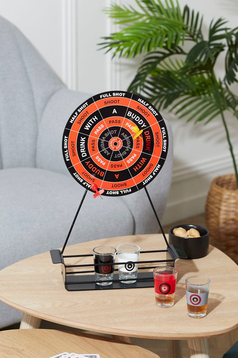 Règles du jeu : Ce jeu de fléchettes devrait vous motiver pour bien viser : atteignez le centre de la cible et c'est la tournée générale ! Chaque zone de la cible correspond à un gage : boire un demi-verre, un verre entier, boire avec un ami.