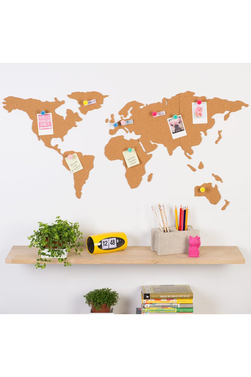 Ce planisphère en liège permet d'épingler toutes vos idées les plus géniales, photos souvenirs, mots doux, billets de concerts...