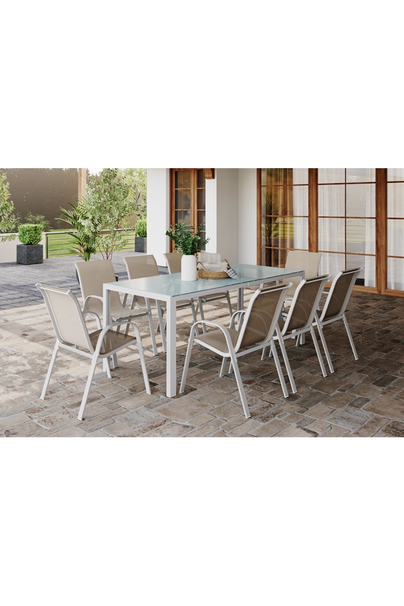 Ensemble repas Minorca 8 places en textilène et verre trempé blanc et beige