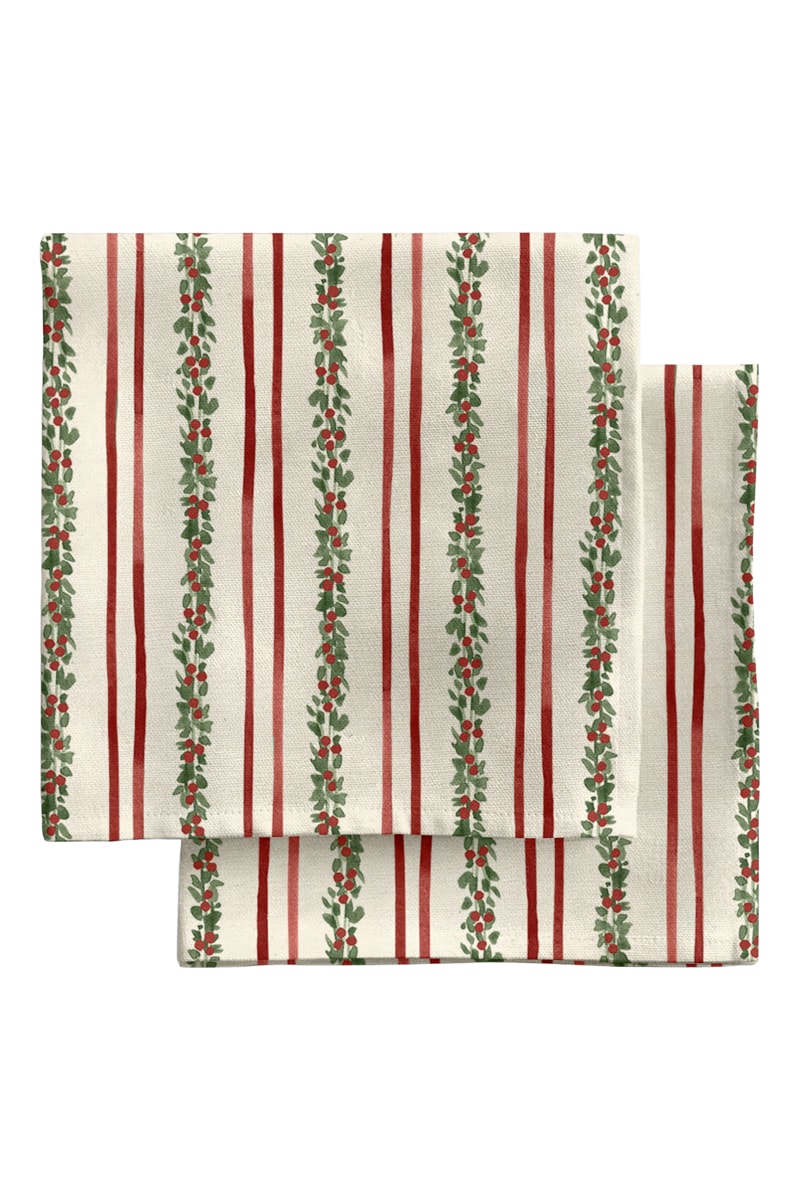 2 serviettes de table en coton, motif rayures et feuillage imprimé. Finition hydrophile pour une meilleure absorption des liquides. Résistantes, ne laissent pas de peluches. Idéales pour sécher la vaisselle et les couverts.