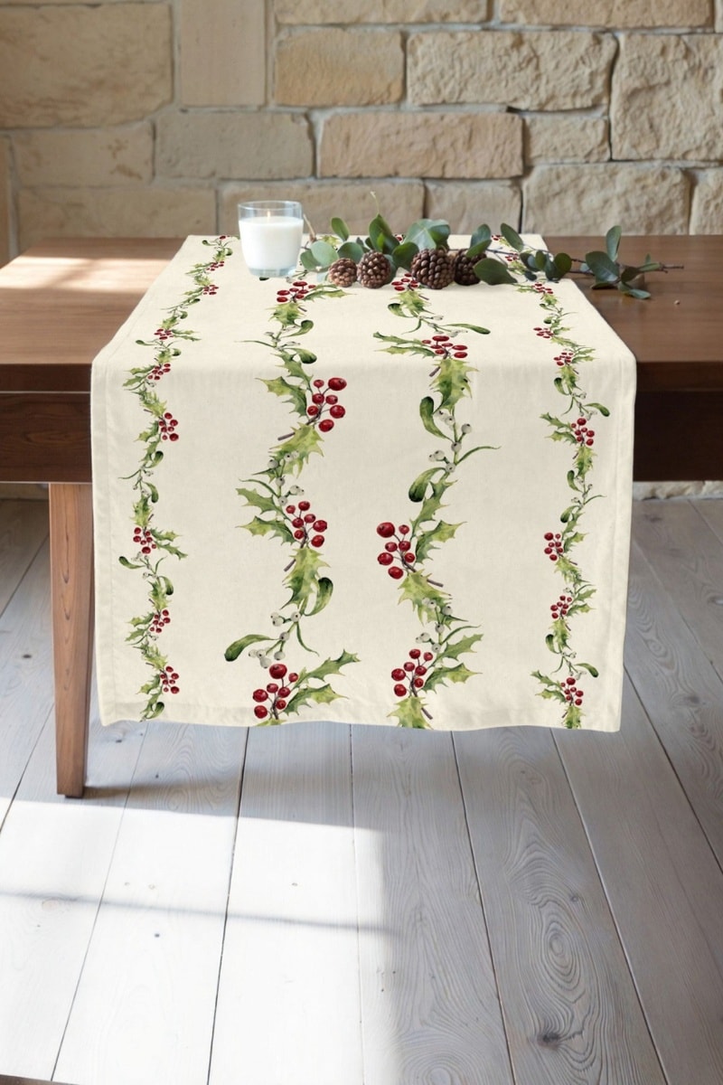 Chemin de table rectangulaire en coton biologique, motif végétal avec branches de houx. Facile à rouler, il apporte une touche de distinction et de décoration à votre intérieur. S’accorde avec toute vaisselle et accessoires disponibles dans la catégorie Art de la table.