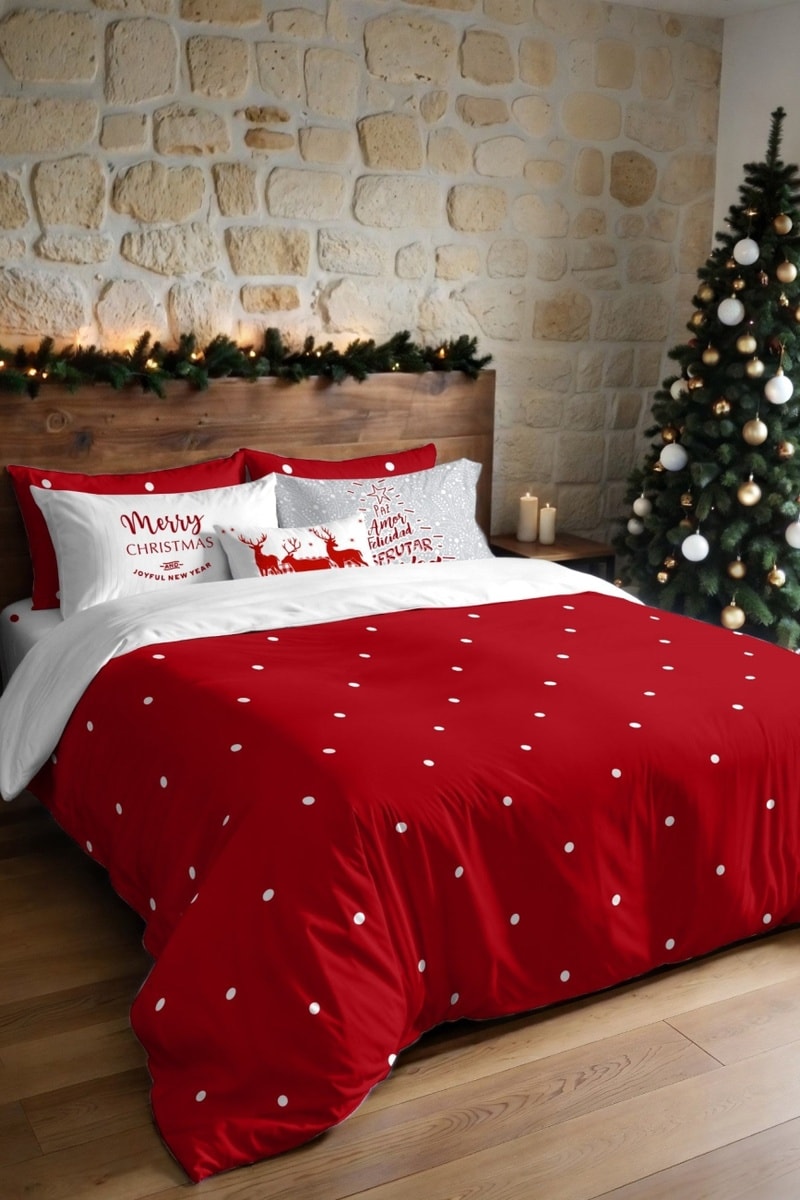 Housse de couette d’inspiration festive, idéale pour transformer votre chambre en un véritable cocon de Noël. Motif pois sur fond rouge, parfaite pour apporter chaleur, couleur et style à votre lit durant la saison hivernale. Fermeture pressionnée discrète pour une utilisation facile. Tissu extra doux 100% coton, offrant confort et douceur tout au long de la nuit.