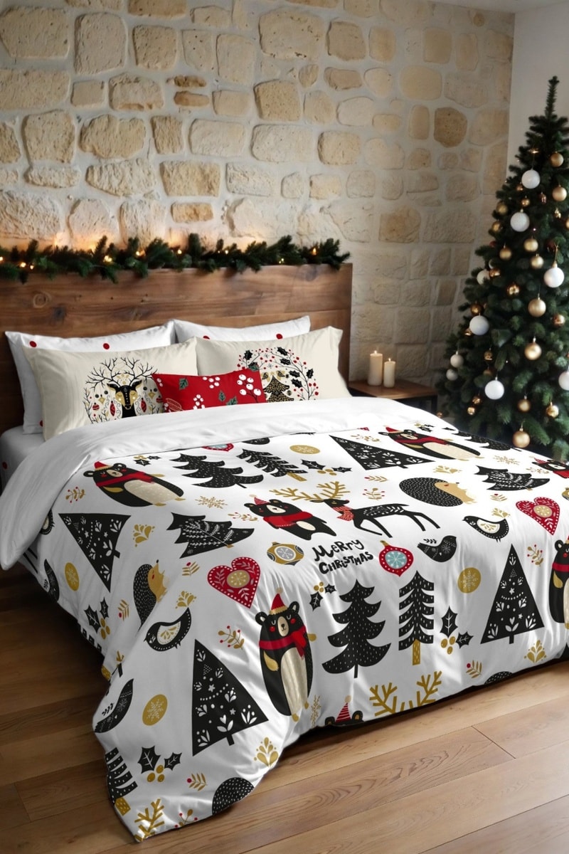 Housse de couette d’inspiration Nordique et festive, issue de la collection Laponie. Transformez votre chambre en un véritable cocon de magie grâce à ses motifs originaux : animaux, sapins, cœurs, oiseaux, boules de Noël et étoiles. Son tissu extra-doux au toucher coton offre une sensation confortable et chaleureuse toute la nuit. Pratique, la housse est équipée d’une fermeture à pressions cachées pour insérer et retirer facilement la couette. Les couleurs vives et les imprimés durables résistent aux lavages, pour une parure toujours impeccable sans besoin de repassage. Idéale pour apporter chaleur, couleur et esprit de fête à votre lit.