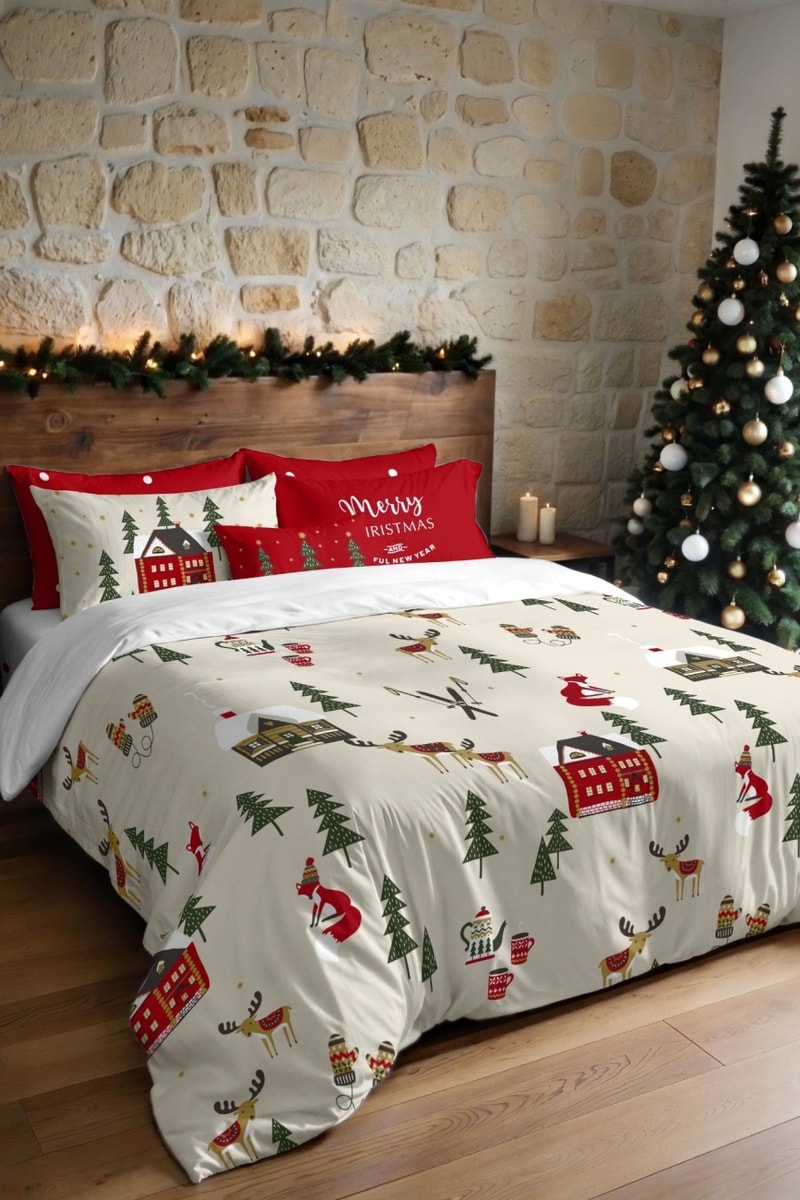 Housse de couette d'inspiration Nordique et festive, idéale pour transformer votre chambre en un véritable cocon de Noël. Motifs de sapins, maisons, rennes, Père Noël, skis et moufles pour une ambiance chaleureuse et magique. Fermeture pressionnée discrète pour une installation facile et rapide du garnissage. Tissu extra-doux au toucher coton, offrant confort et douceur tout au long de la nuit. Pratique et stylée : ne se froisse pas, sèche rapidement et conserve des couleurs éclatantes lavage après lavage.