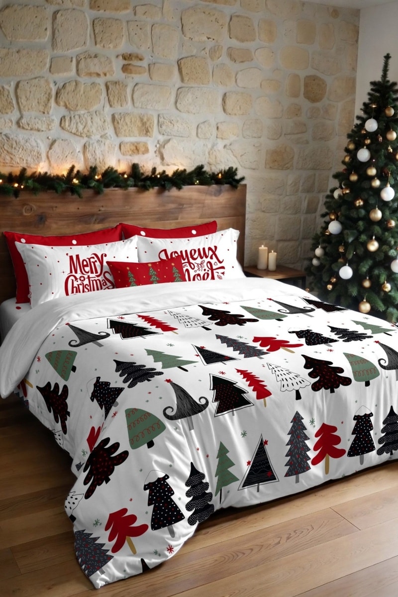Housse de couette d’inspiration Nordique et festive, idéale pour transformer votre chambre en un véritable cocon de magie pendant les fêtes. Motifs sapins stylisés et colorés pour une ambiance chaleureuse et joyeuse. Fermeture pressionnée discrète pour une installation facile et rapide du garnissage. Tissu extra-doux au toucher coton, offrant confort et douceur tout au long de la nuit. Ne se froisse pas, sèche rapidement et conserve des couleurs éclatantes lavage après lavage.