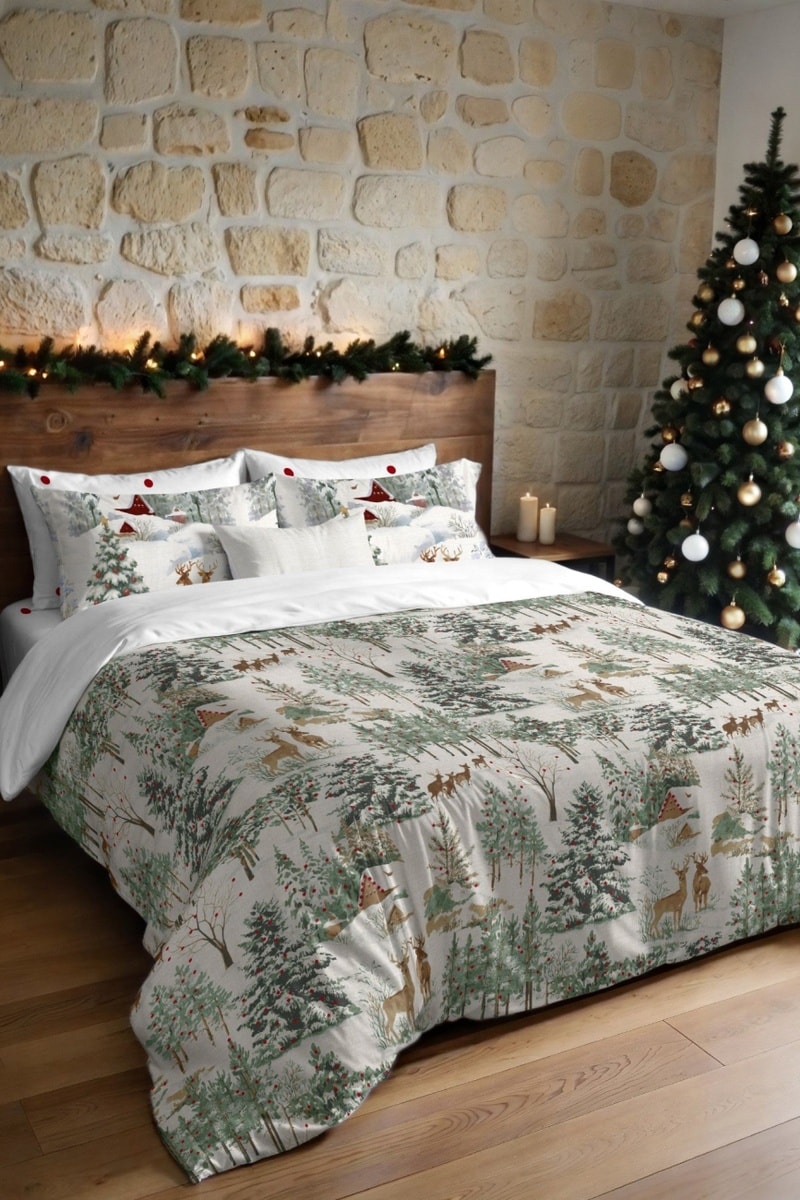 Motif forêt de Laponie avec cerfs et sapins enneigés, ambiance festive et chaleureuse inspirée de Noël.