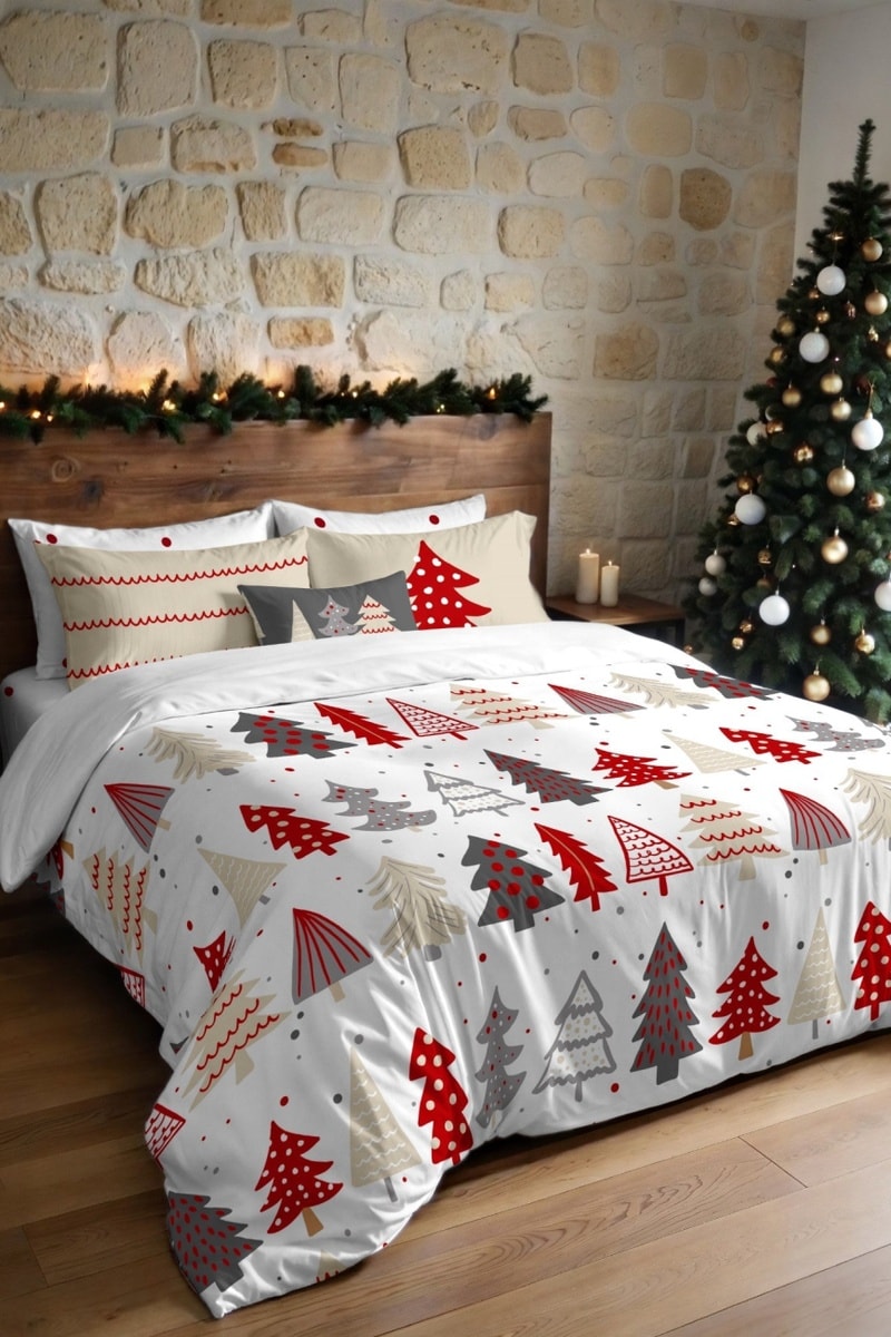 Housse de couette d’inspiration festive, idéale pour transformer votre chambre en un véritable cocon de magie hivernale. Motifs sapins rouges, gris et beiges pour une ambiance chaleureuse et colorée. Tissu extra-doux au toucher coton, pour un confort optimal toute la nuit. Fermeture pressionnée discrète pour insérer et retirer facilement la couette. Pratique, elle ne se froisse pas, sèche rapidement et conserve des couleurs éclatantes lavage après lavage. Parfaite pour renouveler votre lit avec style et esprit de fête.