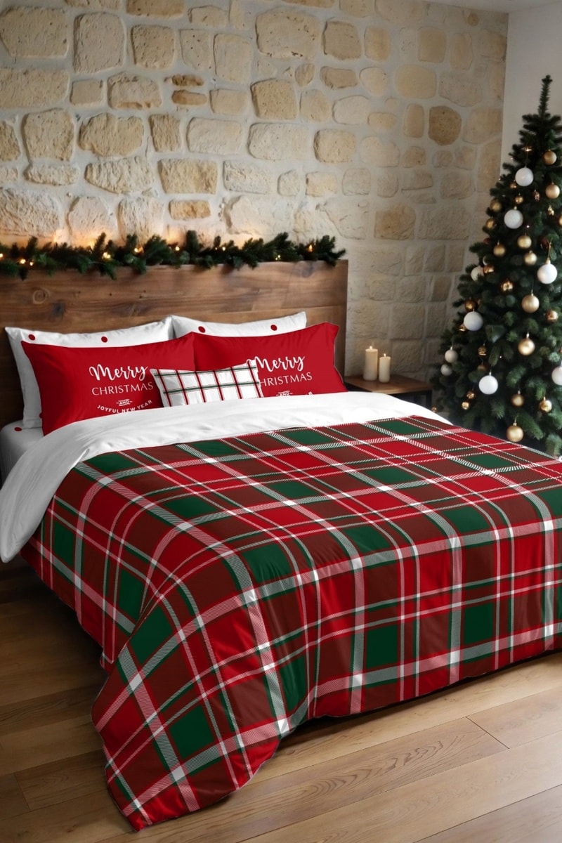 Housse de couette d’inspiration festive, idéale pour transformer votre chambre en un véritable cocon de magie hivernale. Motif tartan aux couleurs vives et durables, parfait pour apporter chaleur, couleur et style à votre lit pendant la saison de Noël. Fermeture pressionnée discrète pour insérer et retirer facilement la couette. Tissu extra-doux au toucher coton, garantissant confort et douceur toute la nuit. Pratique et stylée, elle ne se froisse pas, sèche rapidement et conserve son éclat lavage après lavage.