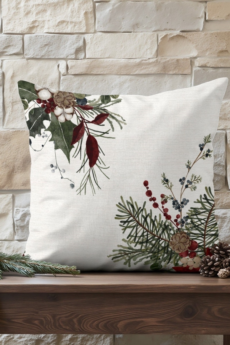 Housse de coussin en coton, ornée de motifs floraux inspirés de la forêt d'hiver.