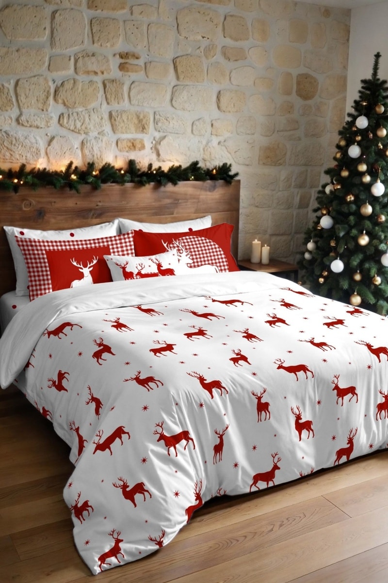 Housse de couette d’inspiration festive, motif cerfs et étoiles rouges, idéale pour transformer votre chambre en un véritable cocon de magie hivernale. Fermeture pressionnée discrète pour une installation rapide et facile du garnissage. Tissu extra-doux au toucher coton, conçu pour offrir confort et chaleur tout au long de la nuit. Facile d’entretien : ne se froisse pas, sèche rapidement et conserve des couleurs éclatantes lavage après lavage. Disponible en plusieurs tailles pour s’adapter à votre lit et à votre matelas.