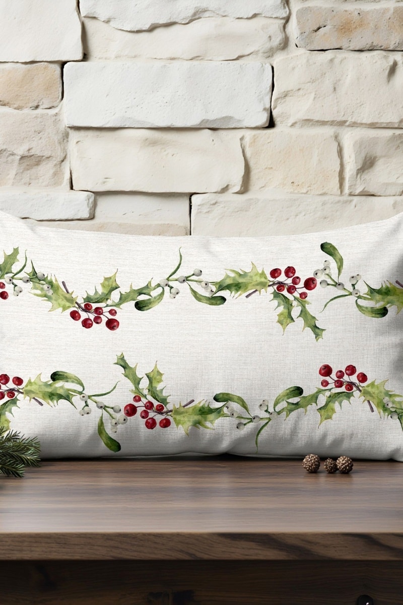 Motif végétal inspiré de la forêt d'hiver, avec des branches de houx et baies rouges.
