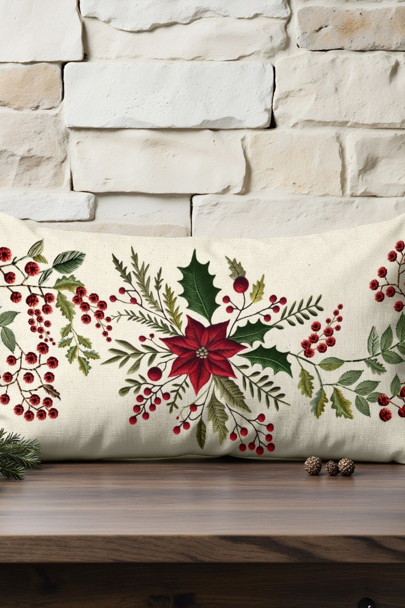 Motif végétal brodé inspiré de la forêt d'hiver, avec des baies rouges et feuillages.