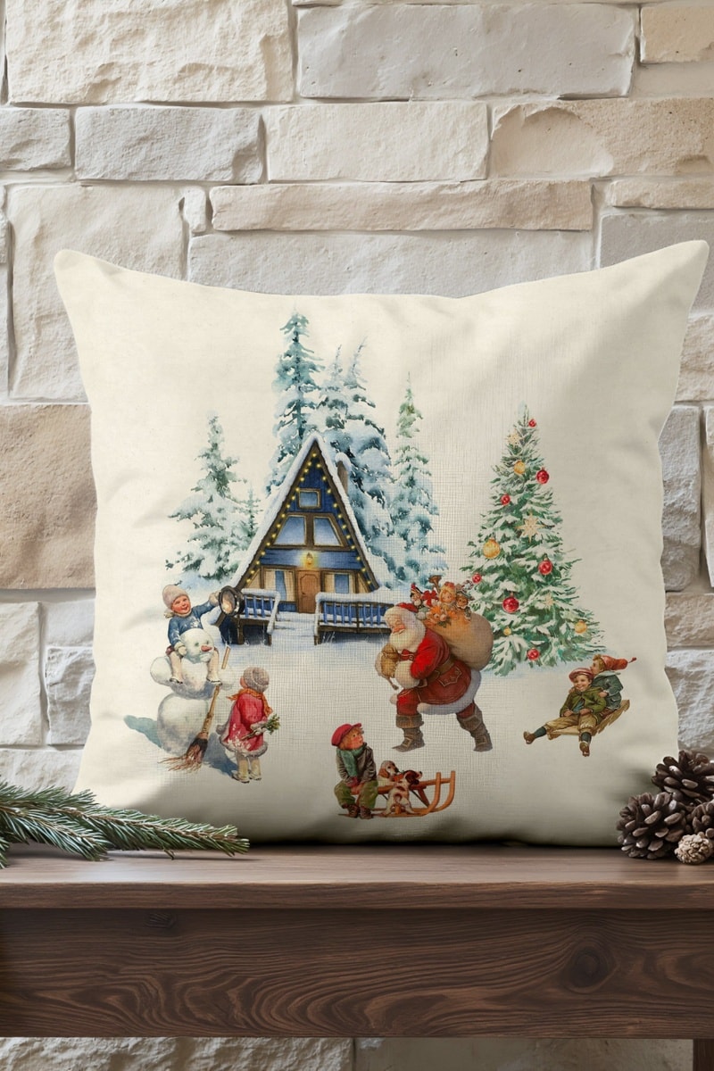 Housse de coussin décorative en coton naturel, issue de la collection Forêt d'Hiver. Motif imprimé représentant une scène hivernale avec sapins enneigés, maison, père Noël et enfants. À assortir avec nos nappes et autres accessoires pour créer une ambiance chaleureuse et festive dans votre intérieur. Housse vendue sans le coussin de garnissage.