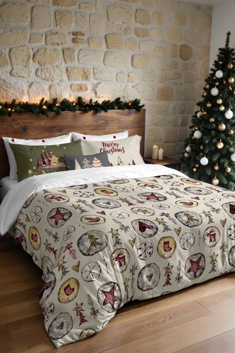 Motifs festifs : étoiles, sapins, cœurs et rennes, pour une ambiance chaleureuse et colorée dans la chambre.
