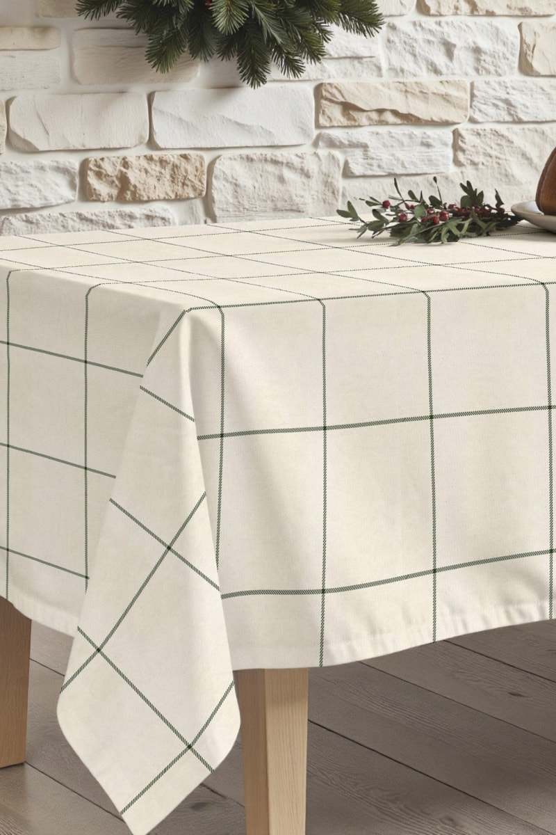 Nappe antitache rectangulaire en coton naturel, motif à carreaux verts.