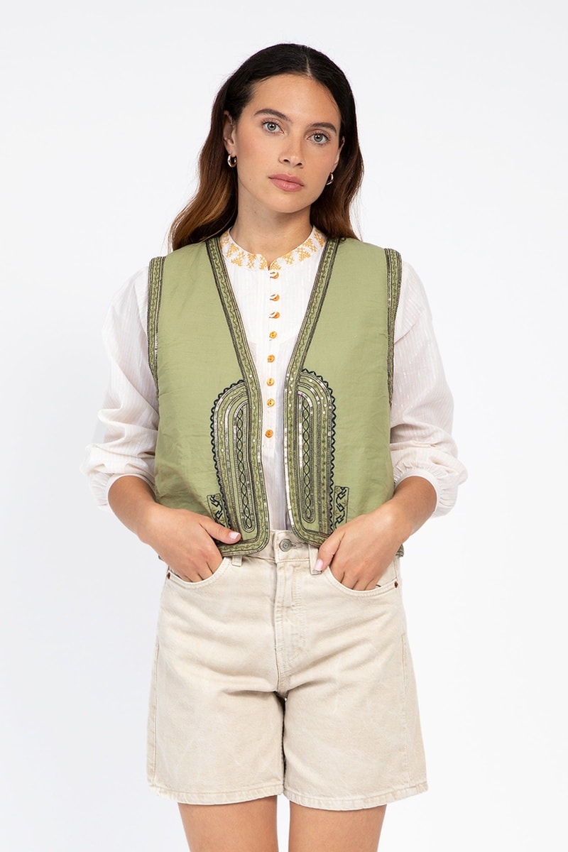 Motifs fantaisie brodés à l’encolure, sur les manches et devant.
