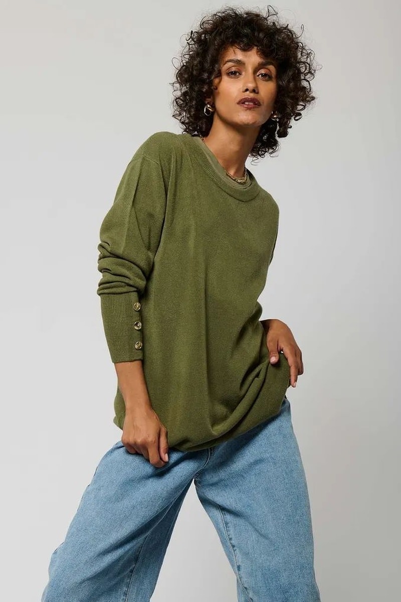 Pull à manches longues avec boutons décoratifs.