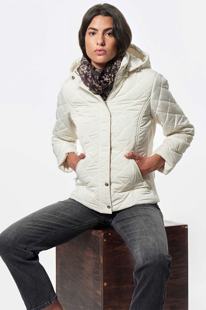 Doudoune à capuche amovible avec liens de serrage et barillets.