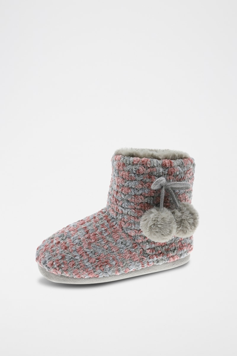 Nœud avec pompons en fourrure synthétique sur le côté.
