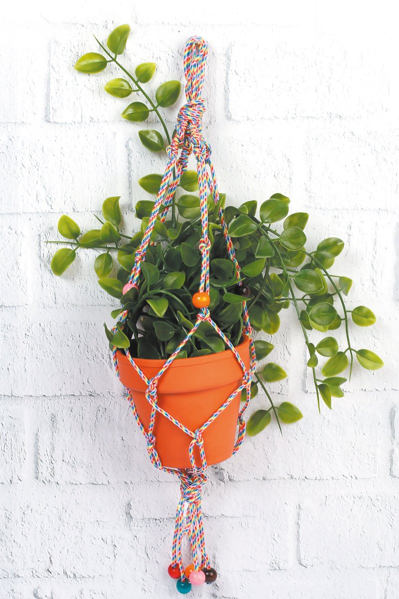 Tressez la suspension avec les fils Créacord et les perles de bois coloré et ajoutez-y le pot de terre inclus.