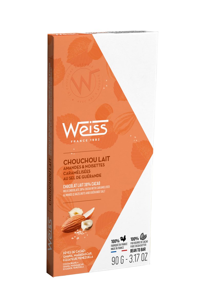 Chocolat au lait chouchou 38%, amandes et noisettes caramélisée.