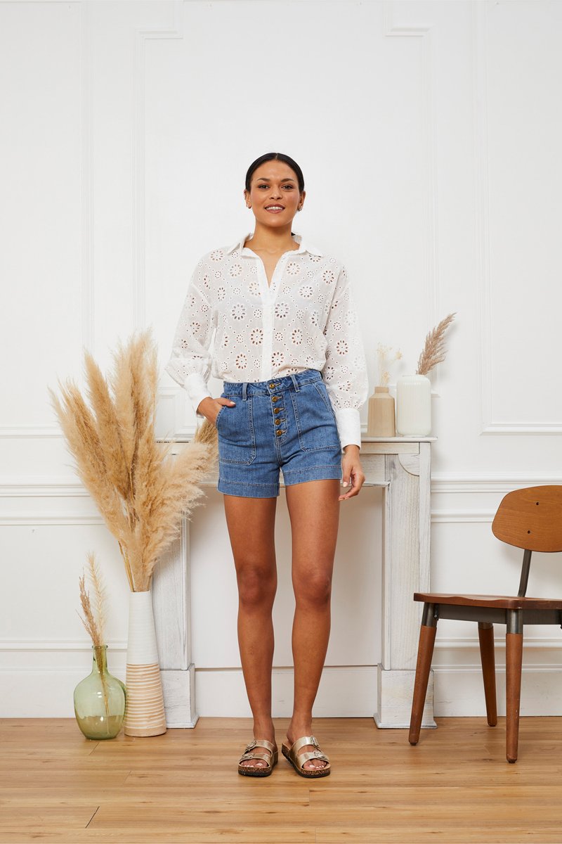 Chemisier en broderie anglaise à manches longues.