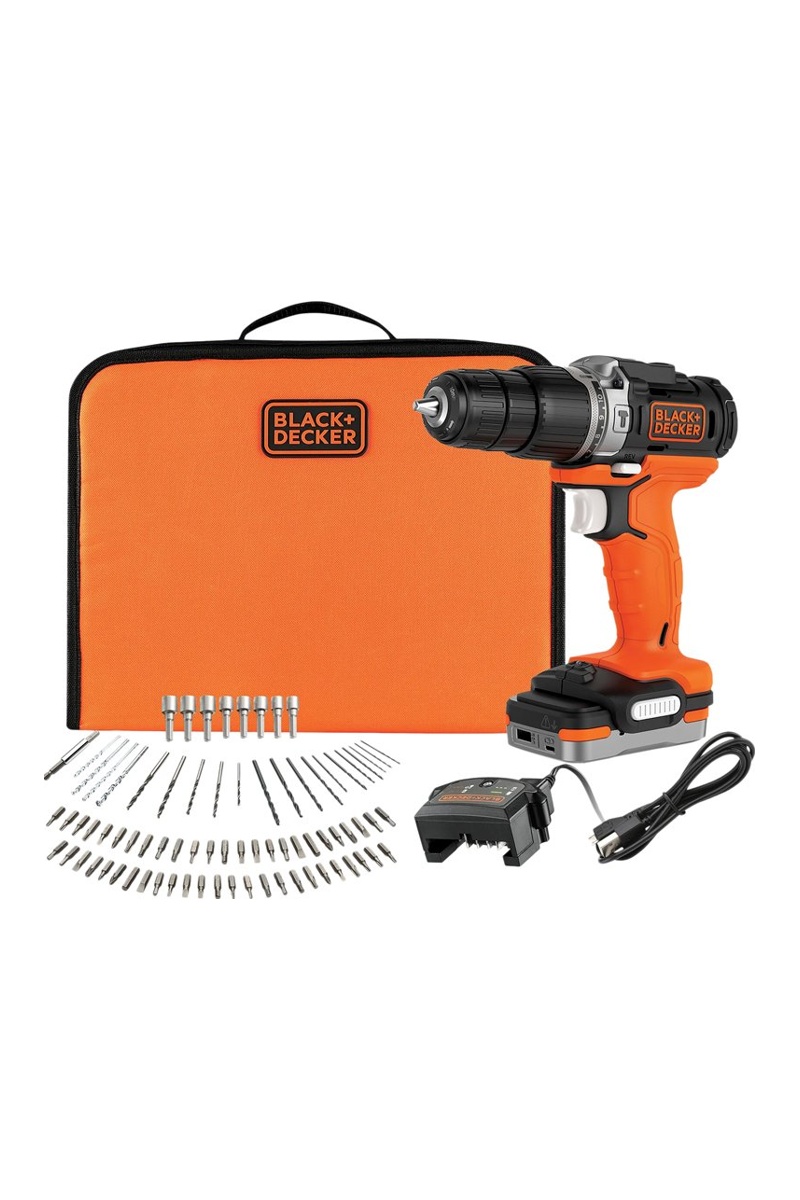 Sac de rangement avec 80 accessoires de perçage-vissage et une batterie 1,5 Ah inclus.