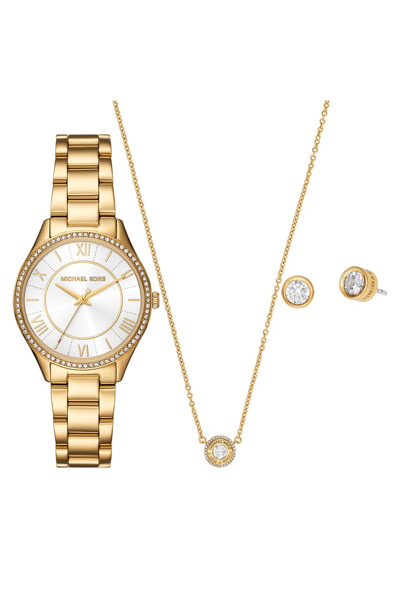 Coffret montre à quartz en acier, collier et puces - Doré et blanc