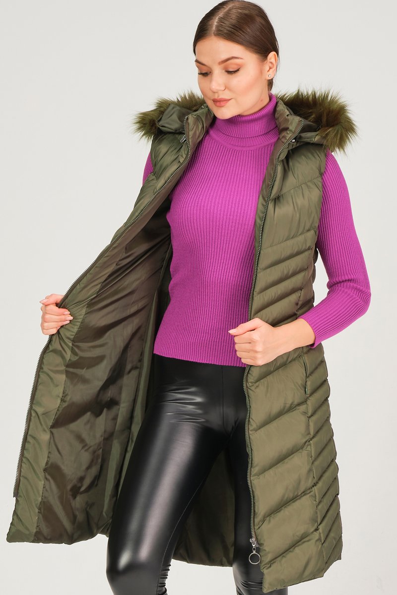 Doudoune longue à capuche amovible en fourrure synthétique.