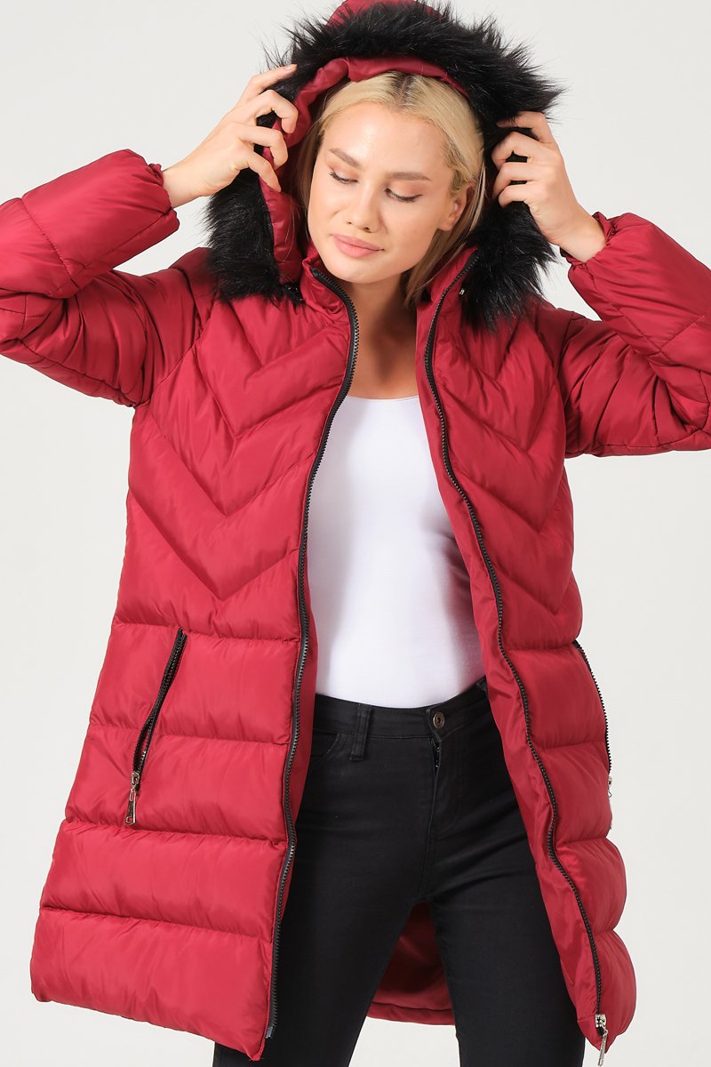 Doudoune à capuche amovible en fourrure synthétique.