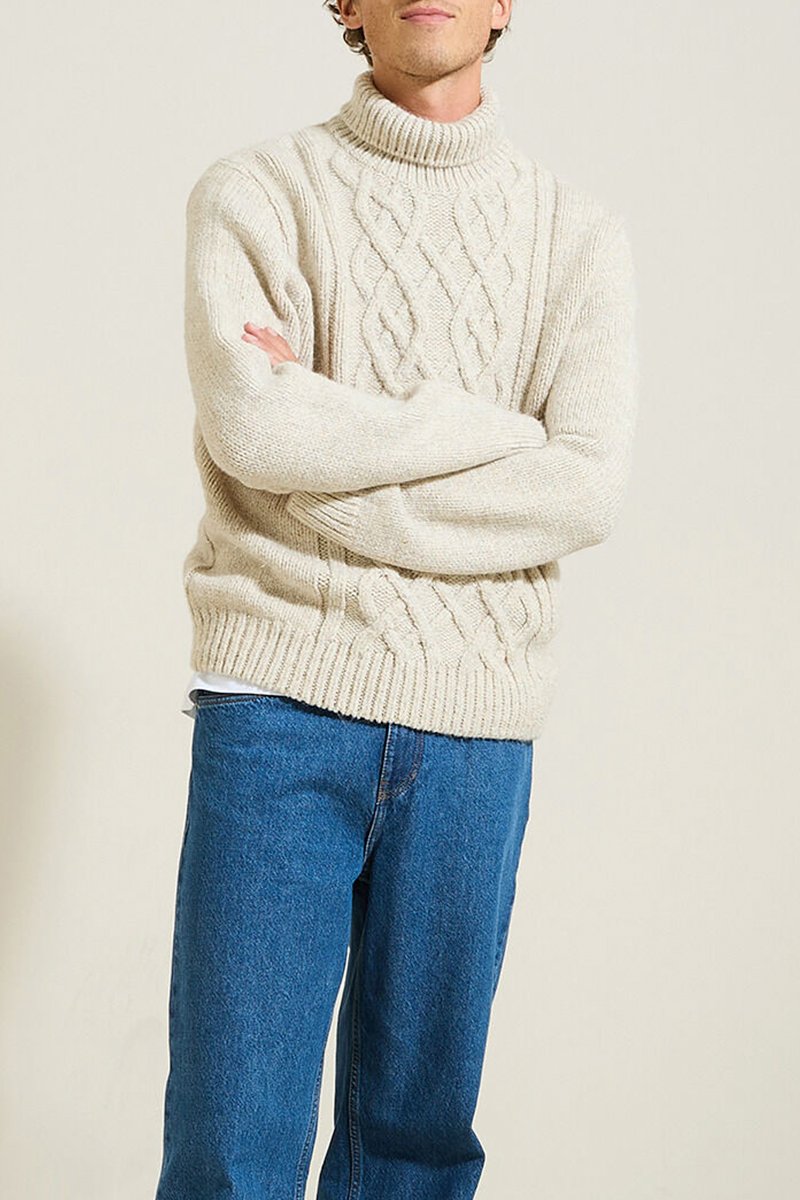 Ce pull col roulé se marie parfaitement avec un jean droit brut pour un look décontracté et élégant. Pour une allure plus habillée, on peut l'associer à un pantalon chino et des derbies. Le mannequin mesure 1m86 et porte du L.