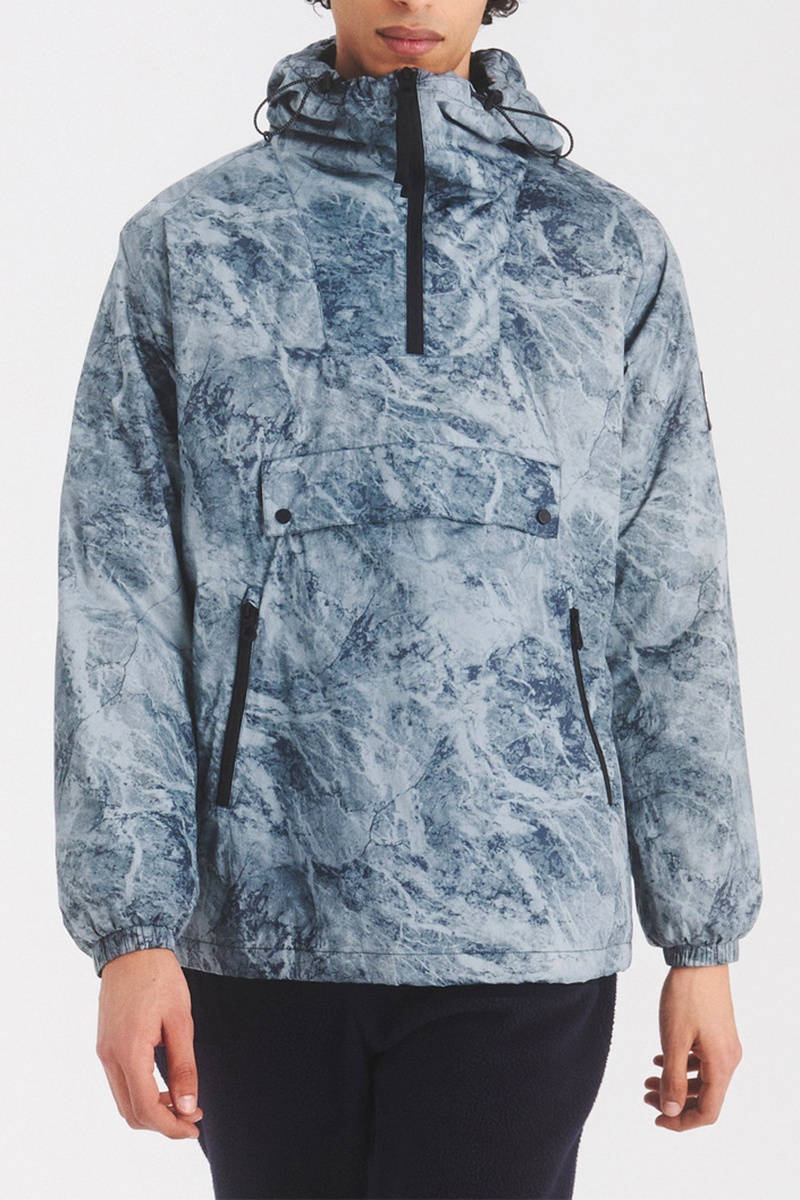 Coupe-vent à capuche avec liens de serrage et barillets.