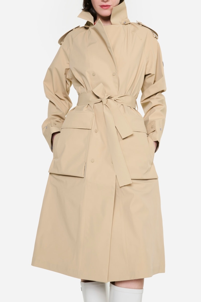 Trench à capuche amovible pressionnée avec liens de serrage.