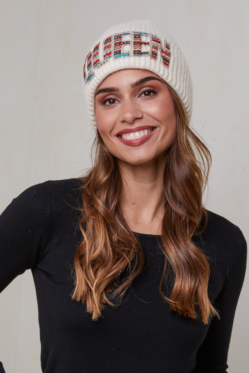 Revers à oreilles avec lettrage brodé à strass à la base.