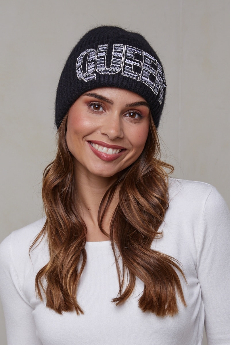 Revers à oreilles avec lettrage brodé à strass à la base.