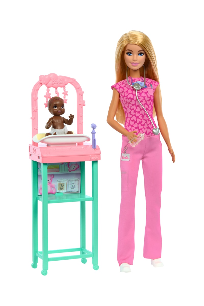Avec cette poupée, les enfants peuvent explorer toutes sortes de métiers, dont celui de pédiatre. Ce coffret, avec Barbie et un adorable petit patient, comprend un décor de cabinet médical. Barbie, prête à faire son métier avec enthousiasme, porte un ensemble de travail rose à imprimé cœur. Le coffret comprend également une table d’examen agrémentée d’étoiles suspendues et d’une étagère basse pour ranger tous les accessoires, tels qu’un biberon ou le stéthoscope de Barbie. En imaginant tout un monde d’histoires et de carrières possibles, cette poupée est prête à inspirer les enfants à devenir ce qu’ils veulent !