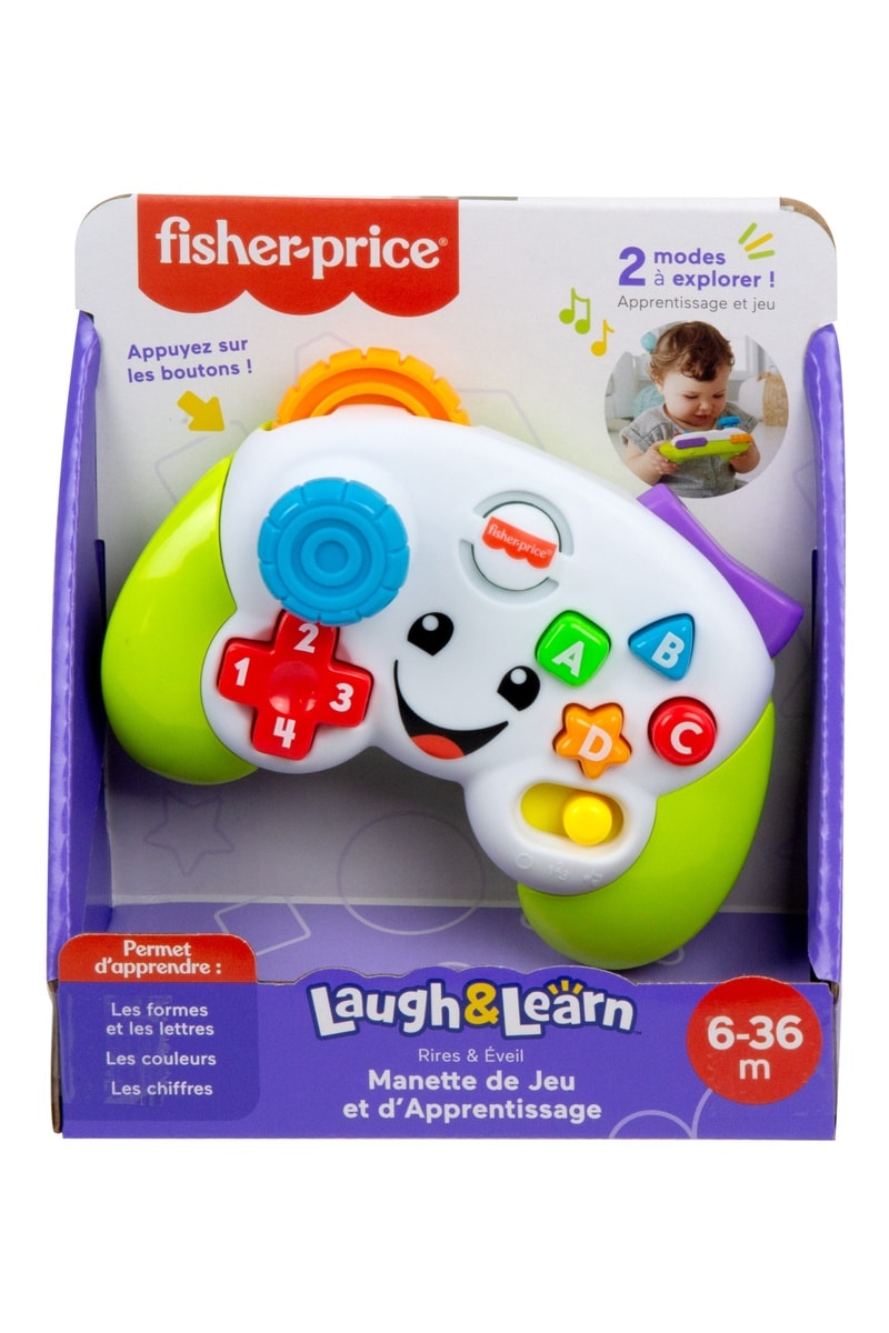 Les bébés et les tout-petits peuvent faire leurs premiers pas dans l’univers du jeu vidéo avec la Manette de Jeux et d’Apprentissages Rires et Éveil® de Fisher-Price®. Cette manette factice propose deux modes de « jeu », des activités amusantes ainsi que des chansons et des phrases qui initient bébé aux chiffres, aux formes, aux couleurs et bien plus encore, pour qu’il continue à jouer et à apprendre. Sa conception réaliste inclut un joystick mobile, ainsi que des boutons ABCD et numérotés sur lesquels appuyer pour activer lumières, musique et sons.