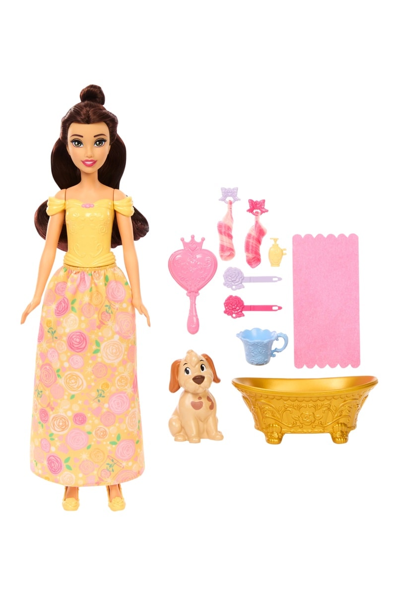 La Princesse Belle de Disney est prête pour le bain et à brosser son adorable chien ! Inspiré du film La Belle et la Bête, ce coffret comprend une poupée Belle dans sa tenue emblématique et une figurine de chien. Avec la baignoire, la serviette et de l’eau chaude, les enfants peuvent toiletter le chien grâce à la magie du changement de couleur, puis le coiffer avec la brosse, les extensions et les barrettes incluses. Belle et son chien sont prêts pour de nouvelles aventures !