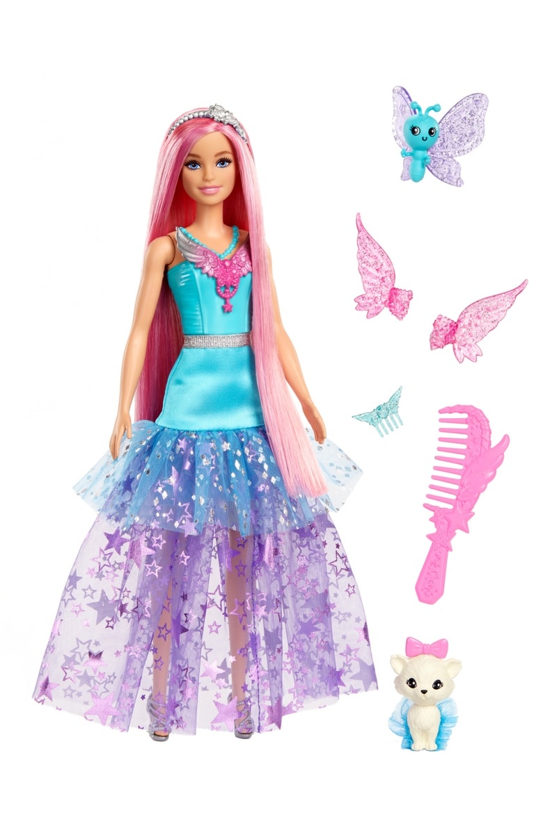 Cette poupée Barbie® Malibu semble tout droit sortie d’un conte de fées avec sa longue chevelure et sa robe étincelante, inspirée du film Barbie A Touch of Magic. Le coffret comprend également deux animaux de compagnie et des accessoires de coiffure pour plonger dans l’univers fantastique du film.