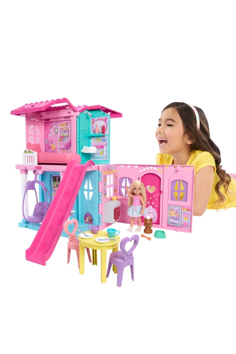 Fournis avec 19 accessoires dans la maison (toboggan, lit, table, chaises..) ainsi que Chelsea et son chien.