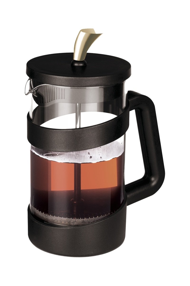 Cafetière à piston en acier inoxydable et verre borosilicate.