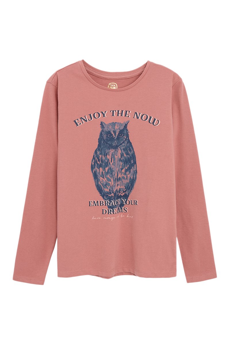 Lettrage et motif hibou devant.