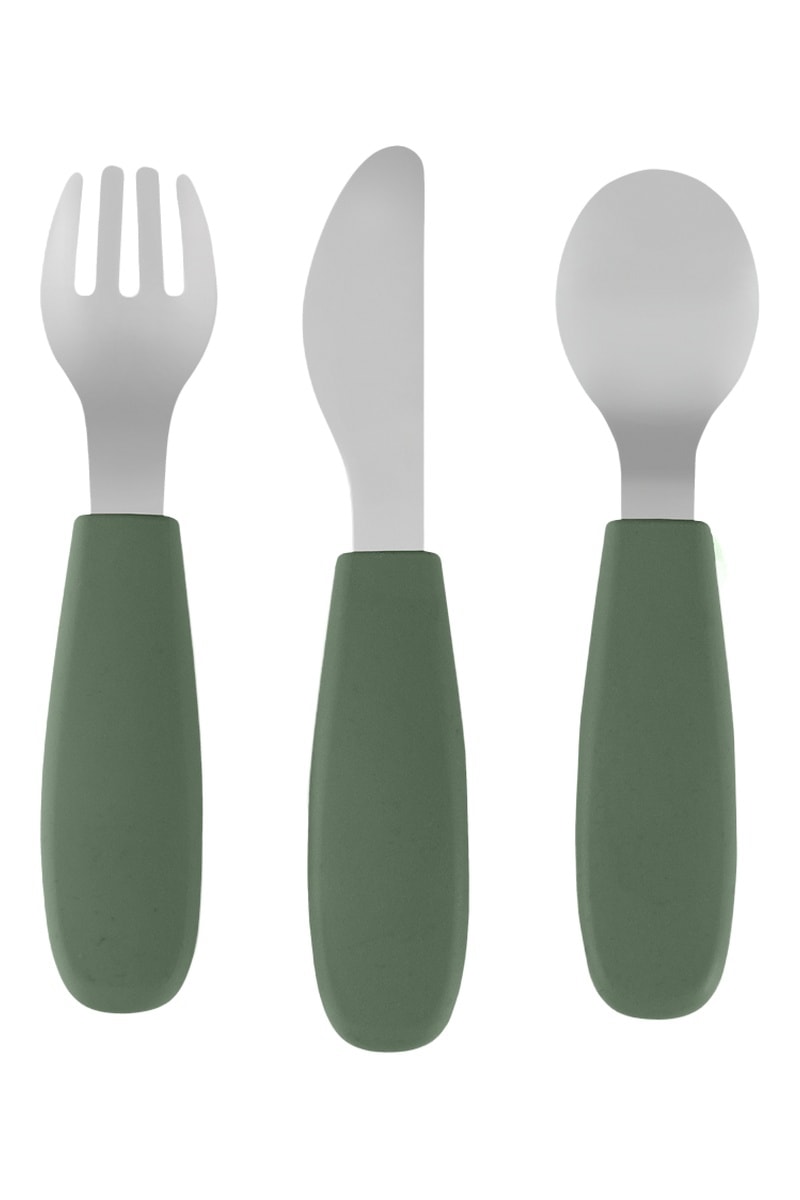 Couverts en acier inoxydable comprenant une fourchette, un couteau et une cuillère.