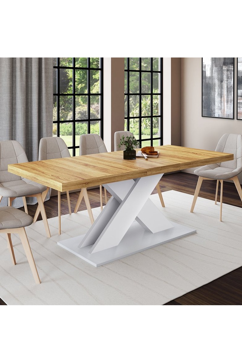 Table à manger extensible en panneaux en particules de bois mélaminé.